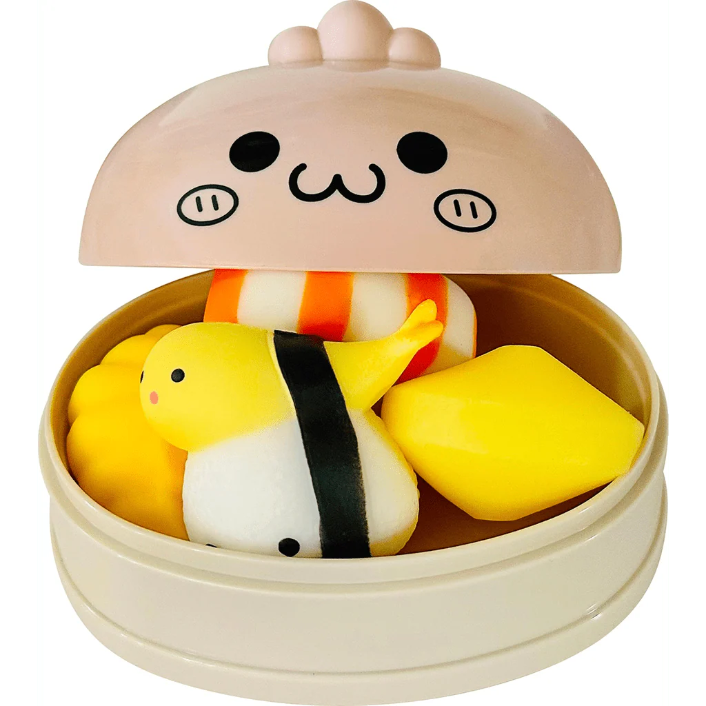 Open this happy face bento box and have SOY much fun squeezing the super squishy surprises inside. There are 2 sushis, a fortune cookie with a fortune, and a dumpling!